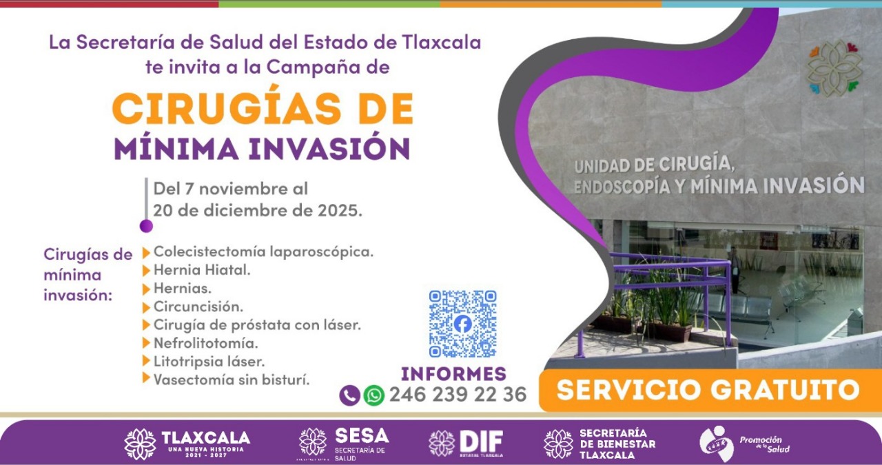 Lee más: INVITA SECRETARÍA DE SALUD A CAMPAÑA DE CIRUGÍAS DE MÍNIMA INVASIÓN EN TLAXCALA