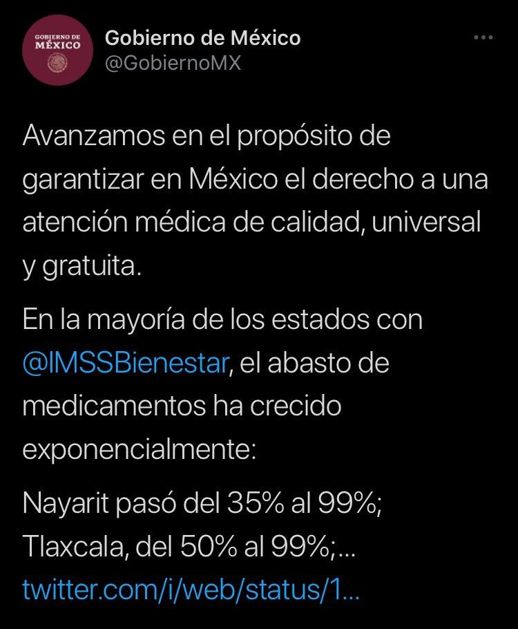 En su Twitter oficial, la Presidencia de México explicó que la entidad gobernada por Lorena Cuéllar Cisneros pasó del 50 al 99 por ciento en el abasto de medicamentos, por lo que creció exponencialmente la disponibilidad de fármacos para la población tlaxcalteca.