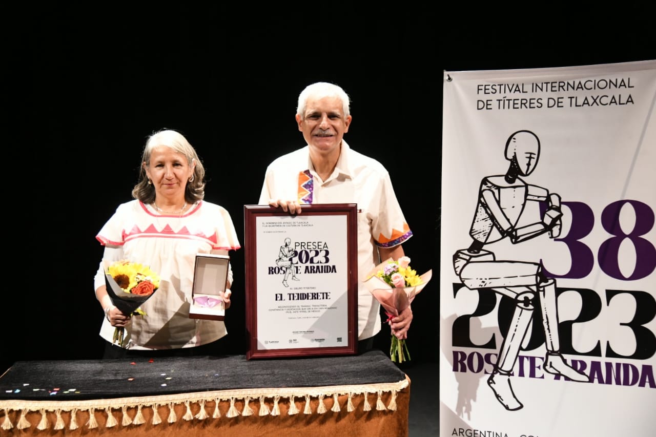 Antes de comenzar la función, el director del Museo Nacional del Títere y coordinador general del Festival, Ignacio Tapia Echávarri entregó la presea Rosete Aranda a la compañía de títeres “El Tenderete” del estado de Chihuahua, integrado por Pilar Cárdenas y Armando Salmaniego, debido a su gran trayectoria a nivel nacional e internacional.