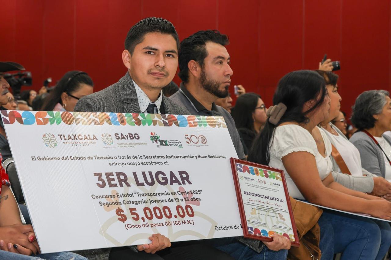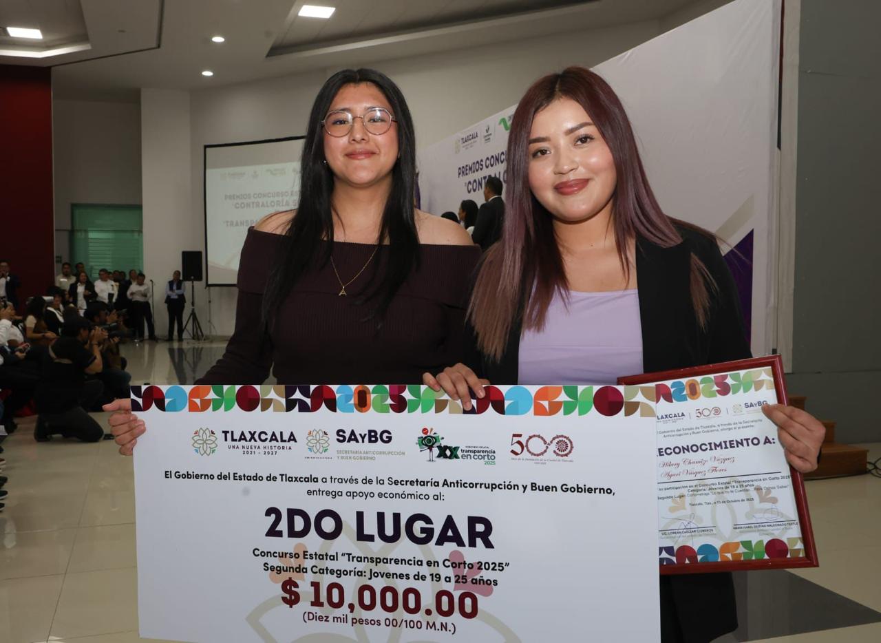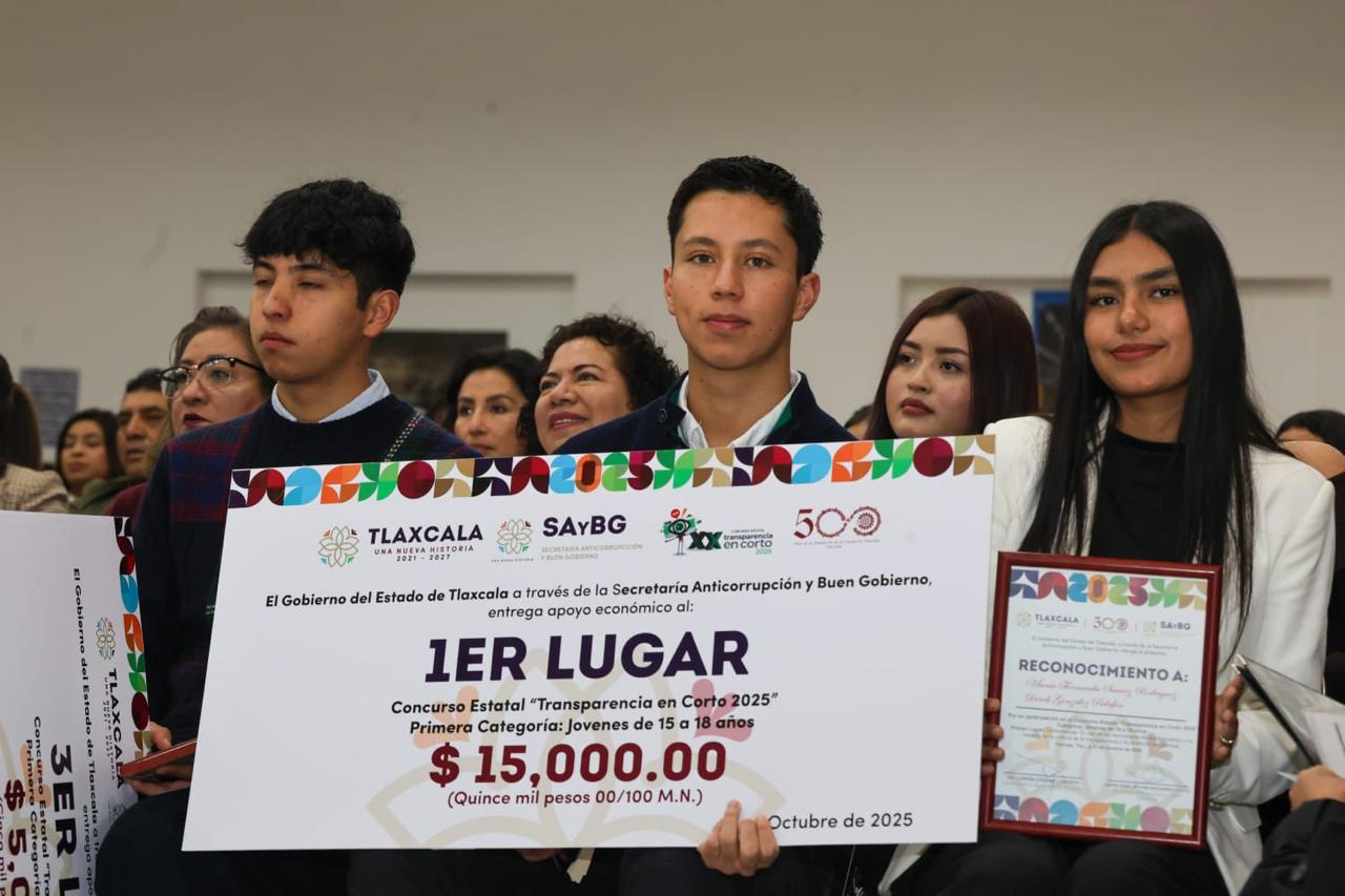 En su oportunidad, María Fernanda Suárez Rodríguez y Derek González Palafox, ganadores del primer lugar en Transparencia en Corto (categoría 15 a 18 años), invitaron a la juventud tlaxcalteca a involucrarse en las acciones del gobierno, “para que sean parte de esta gran historia que escribimos juntos”.