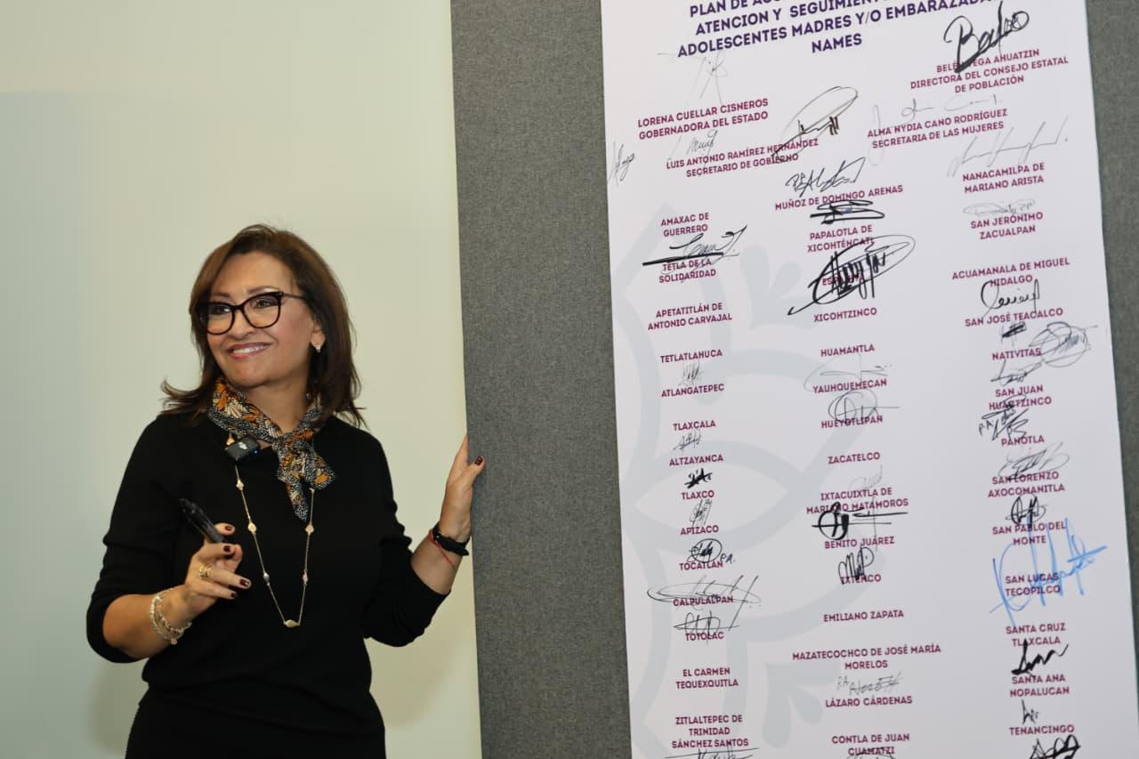 La gobernadora Lorena Cuéllar Cisneros, junto a la secretaria técnica del Consejo Nacional de Población (Conapo), Gabriela Rodríguez Ramírez, y presidentes municipales, firmaron el Plan de Acción para la Prevención, Atención y Seguimiento de Niñas Adolescentes y Madres Embarazadas (NAME), con el objetivo de erradicar el embarazo infantil en el estado.