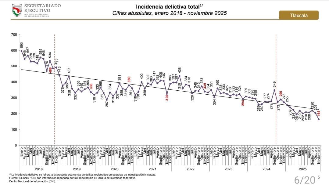 De acuerdo con el reporte del Secretariado Ejecutivo del Sistema Nacional de Seguridad Pública (SESNSP), Tlaxcala reportó una disminución del 18.72 por ciento de delitos, según el corte estadístico al 30 de noviembre de 2025.