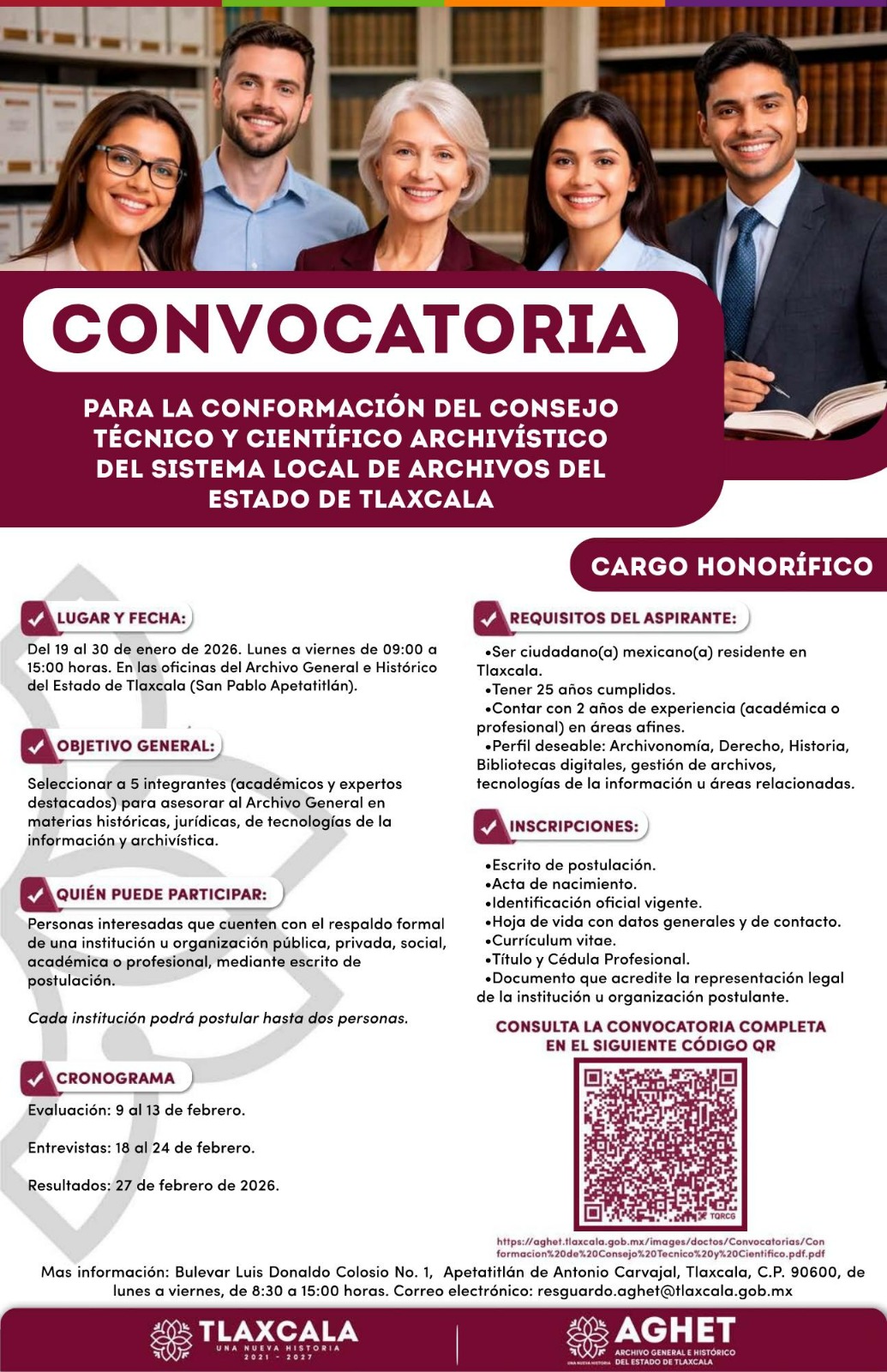 La recepción de postulaciones se podrá realizar hasta el 30 de enero de 2026, en un horario de 9:00 a 15:00 horas, en las oficinas de la Dirección General del Archivo General e Histórico del Estado de Tlaxcala, ubicadas en San Pablo Apetatitlán. Los resultados finales se publicarán el 27 de febrero de 2026 en el sitio oficial de la institución.